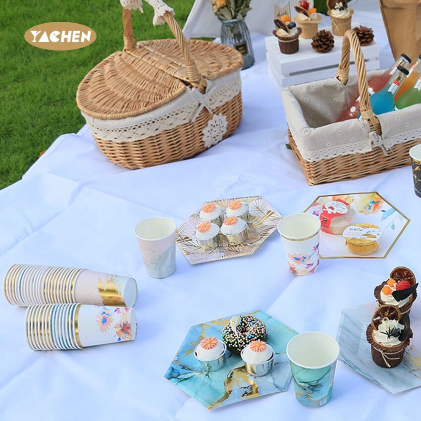 ผลิตจากกระดาษคุณภาพดี, วัสดุเกรดอาหาร, วัสดุกันน้ำ, เหมาะสำหรับใช้บนโต๊ะอาหารปาร์ตี้ปิกนิก.